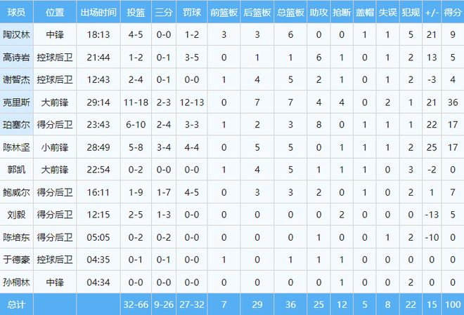 數(shù)據(jù)方面,克里斯36分7籃板4助攻4搶斷,填滿數(shù)據(jù)欄,其中得分創(chuàng)賽季新高。珀塞爾高效砍下17分3籃板8助攻。陳林堅(jiān)三分球4投3中,得到17分,展示了冷面射手的本色,另外,他的正負(fù)值高達(dá)正25,為全場之最。其他球員,陶漢林9分6籃板,鮑威爾7分,高詩巖5分6助攻,劉毅5分,謝智杰4分。